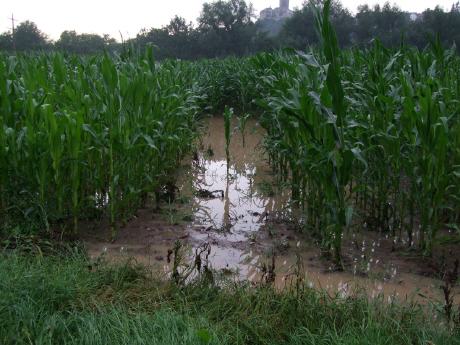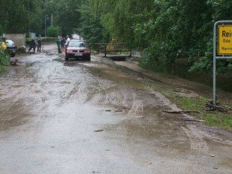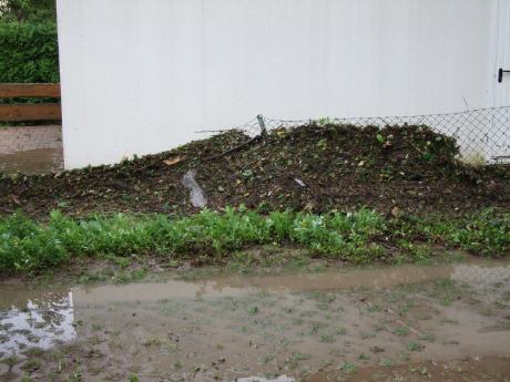 Im Ort hatte der Rohrbach alles auf ca. 80 cm Höhe unter Wasser gesetzt, Zäune mit mitgeführtem Morast und Geschwemme umgedrückt und Keller geflutet
